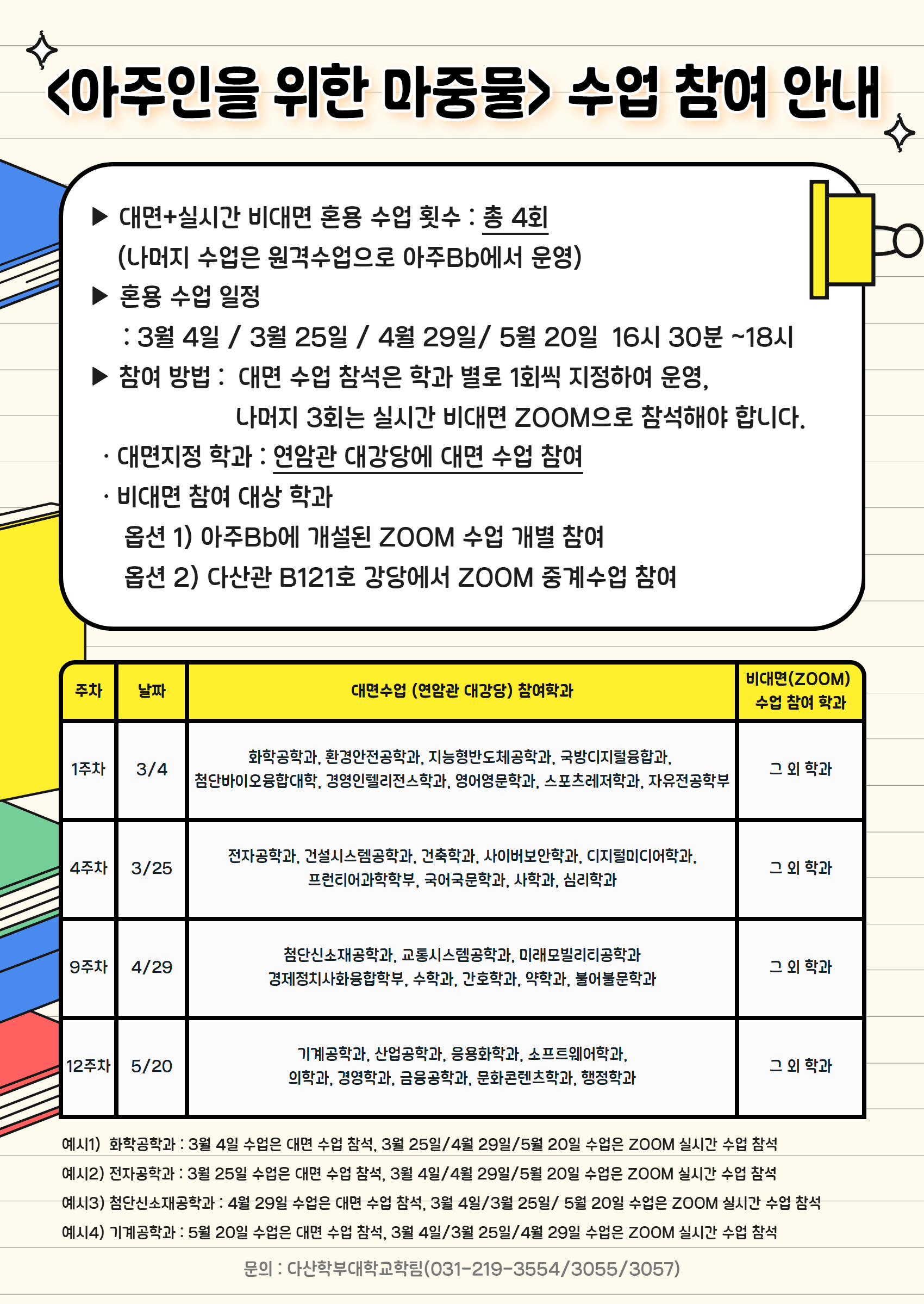 12주차 | 2026.5.20. (수) | 공과대학(기계공학과, 산업공학과, 응용화학과), 소프트웨어융합대학(소프트웨어학과), 경영대학(경영학과, 금융공학과), 인문대학(문화콘텐츠학과), 사회과학대학(행정학과), 의학과 |